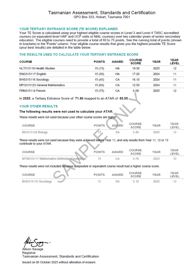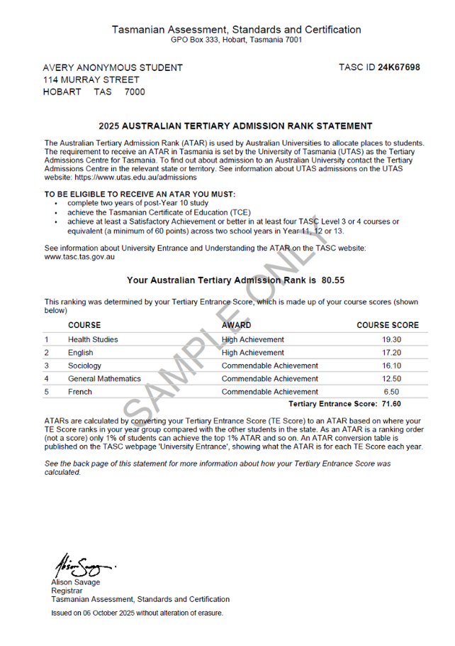 The University of Tasmania operates Tasmania’s Tertiary Admissions Centre for university entrance. Under an agreement, TASC supports the calculation of the Australian Tertiary Admission Rank (ATAR) for eligible Tasmanian students and issues eligible students with an ATAR Statement at the end of their Year 12/13 school year.